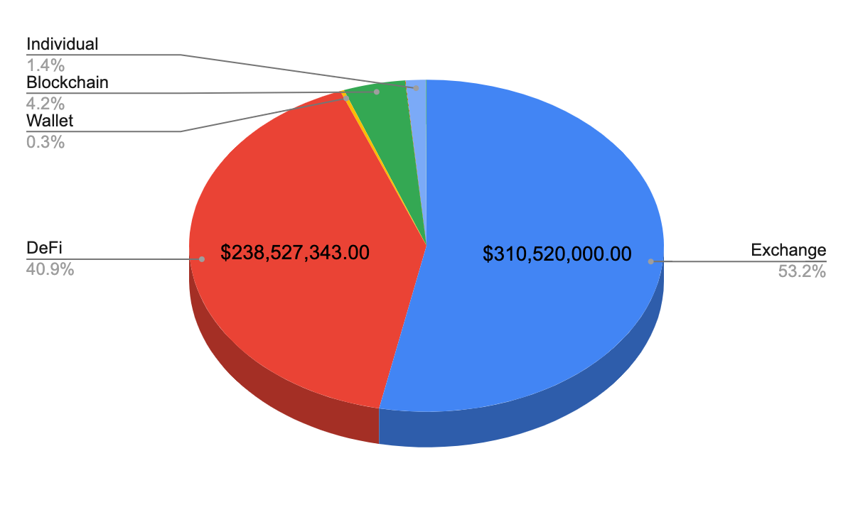 Just as in the past years, cryptocurrency business hacks continue to dominate the total monetary loss especially as the market continues to grow. In 2020 about $300M were stolen across 21 incidents mostly from exchanges. This is an increase from $175M stolen in 11 incidents in 2019.