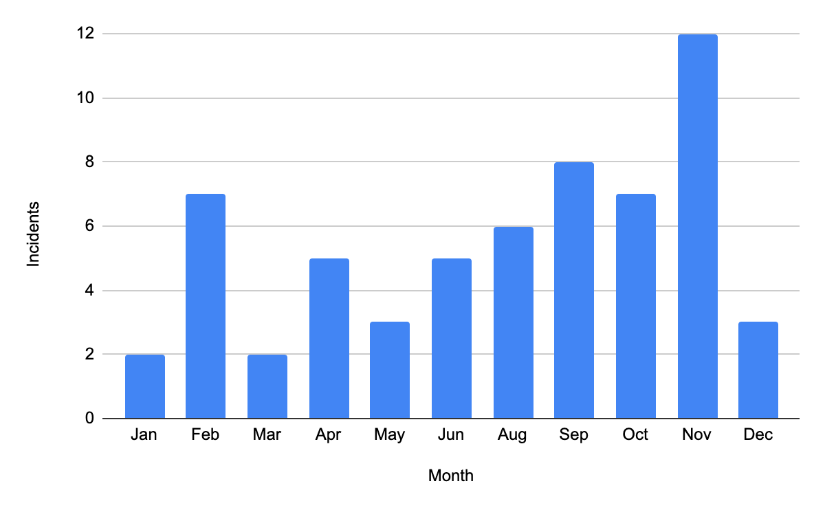 When the dust settled in 2020 about $230M+ were stolen across 60 incidents. Some projects like bZx were repeatedly hacked with ever increasing amounts reaching about $9M of total stolen assets in 2020. It was staggering to watch not only the amounts involved but the sheer frequency with which these hacks happen. For example, in a single month of November $76M worth of tokens were stolen with hacks reported almost every other day: