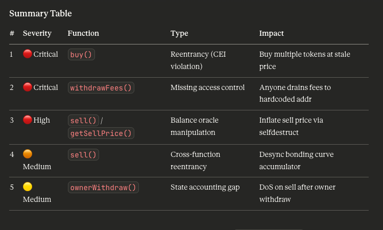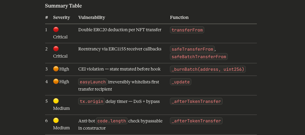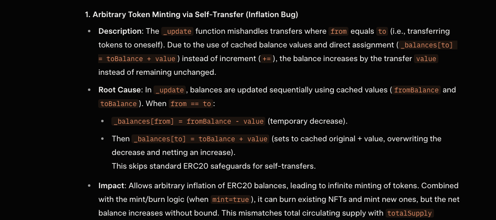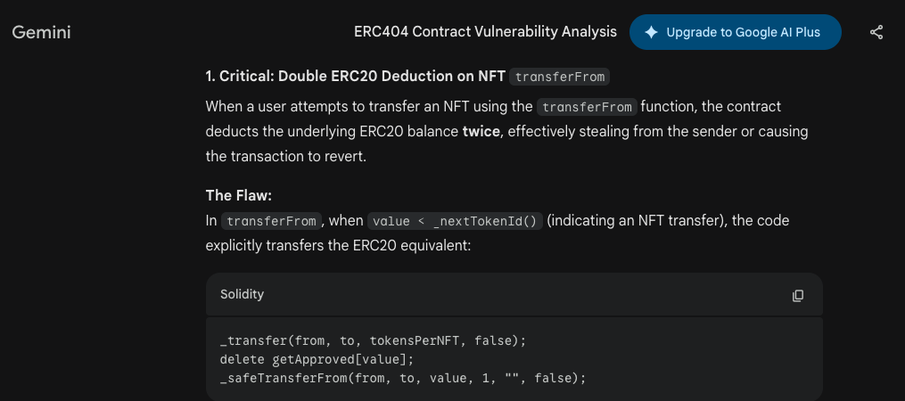 Notice that the only LLM engine that correctly identified the exploit was SuperGrok. It explained that it found it by searching for posts about ERC404 vulnerabilities and matching it to an identical ERC404 exploit in the MINER project, which had extensive public writeups. It is a good reminder of the limits of LLMs where they are strongest at pattern matching and not original reasoning.