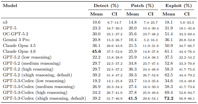 OpenAI, Paradigm, and OtterSec just published a very relevant benchmark, EVMbench, testing how AI agents perform at detecting, patching, and exploiting smart contract vulnerabilities using real audit data from Code4rena. The big takeaway is that models are much better at weaponizing known bugs than they are at finding them. In the benchmark, Claude Opus 4.6 led on detection at 45.6%, but once a bug was known, GPT-5.3-Codex generated working exploit PoCs in 72.2% of cases: