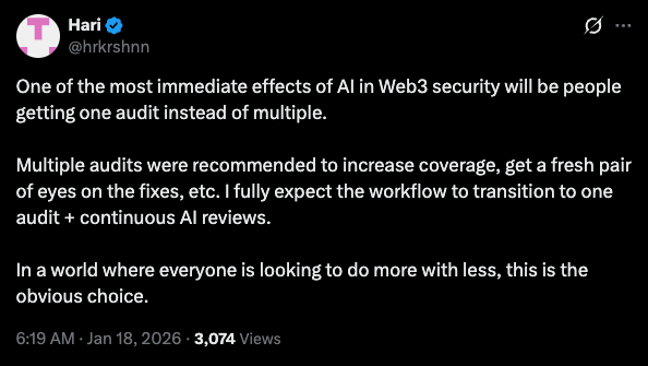 Note: I’m using Hari’s posts as one example of a broader trend, not to single him out. I have a lot of respect for him and appreciate everything he has done to make the ecosystem safer, including thinking forward about the future of audits.